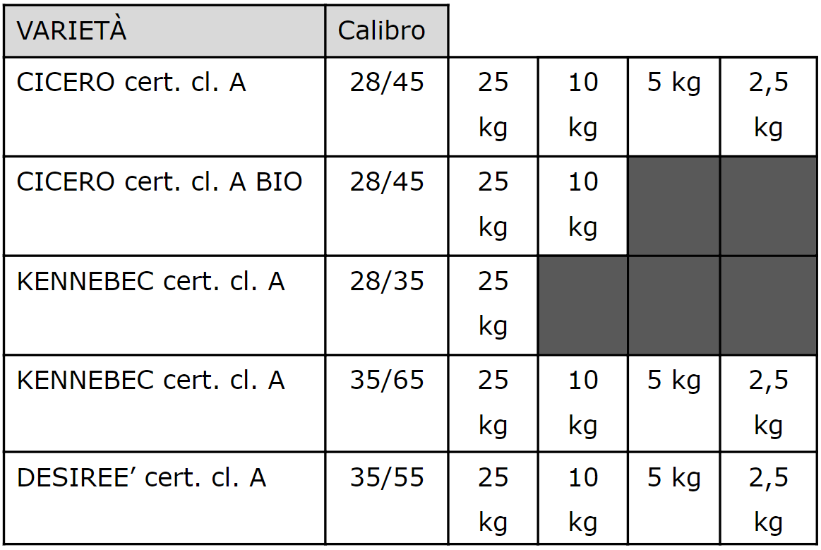 In seguito, elenchiamo le patate da seme che abbiamo disponibili e le confezioni che possiamo proporre: